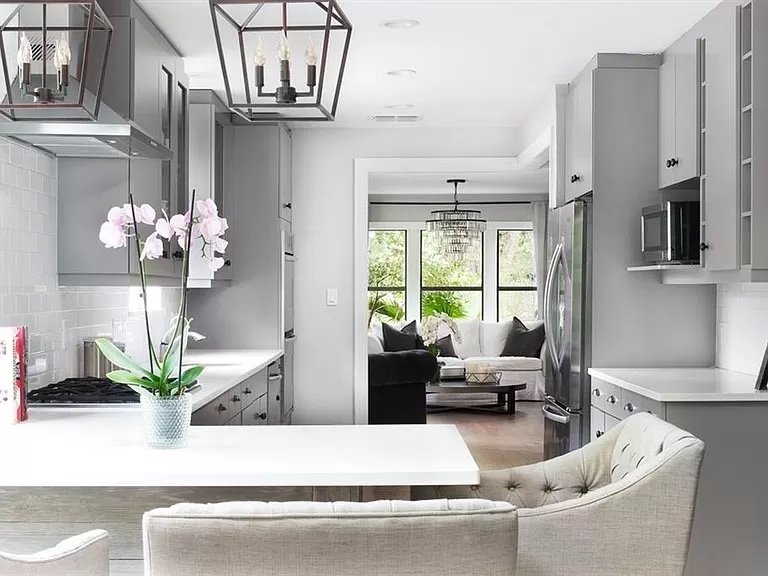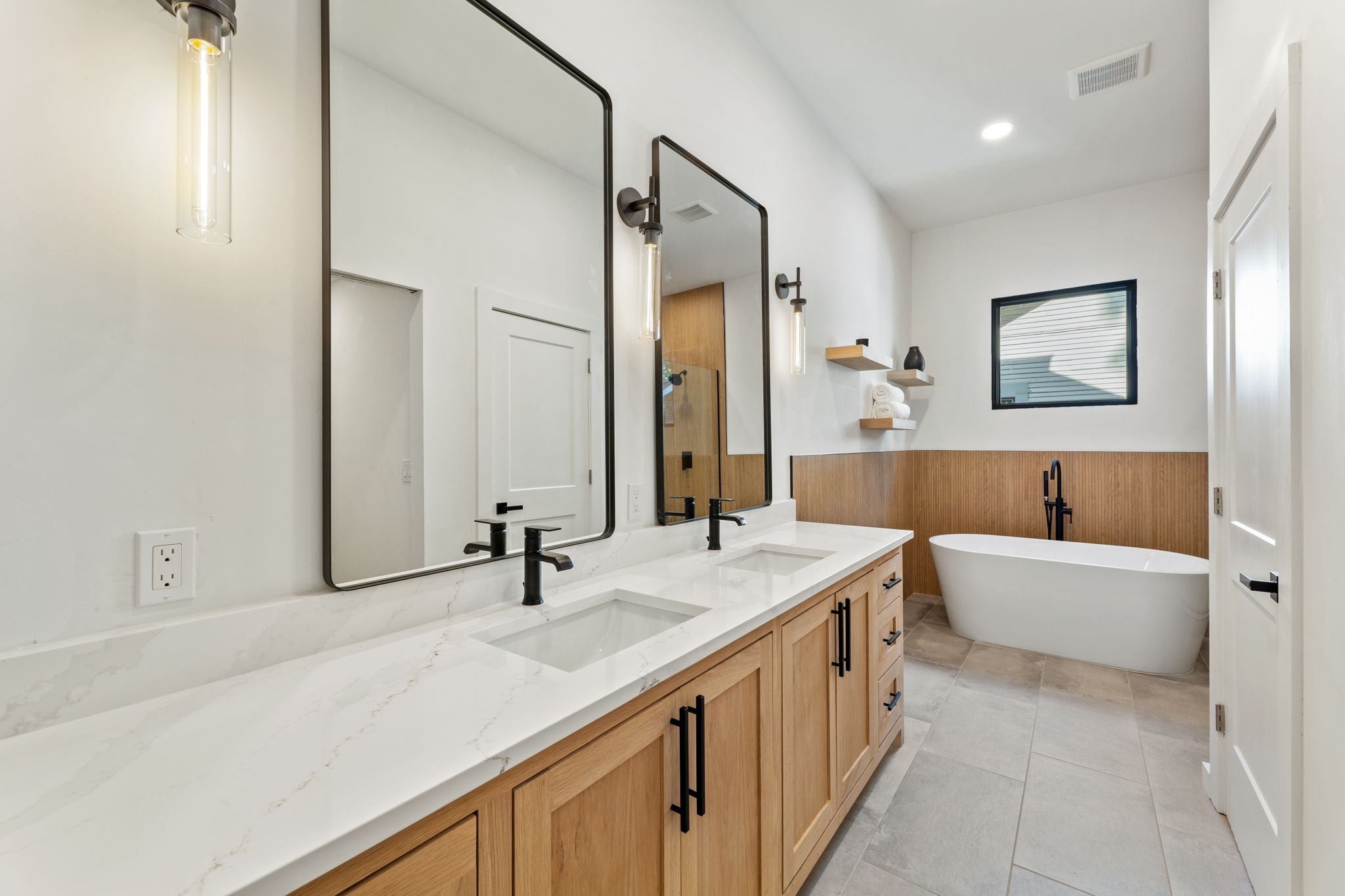 This 800 sq ft 2 bedroom and 1 bath bungalow was completed gutted with 200 sq ft of kitchen, utility room, and back deck demolished. The original bedrooms were converted into 1 primary bedroom and the ceiling support beams were lifted into the attic space to create a more continuous space that flowed into the two-story addition that resulted in a 2300 sq ft property!